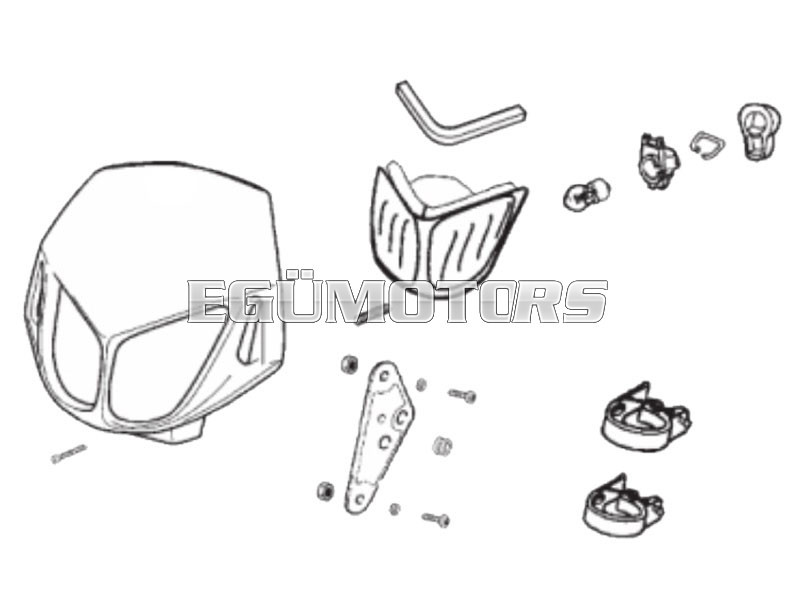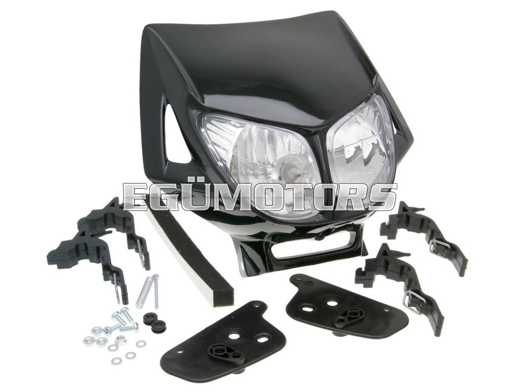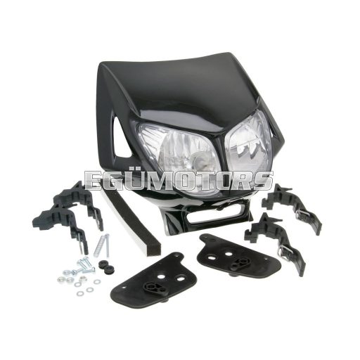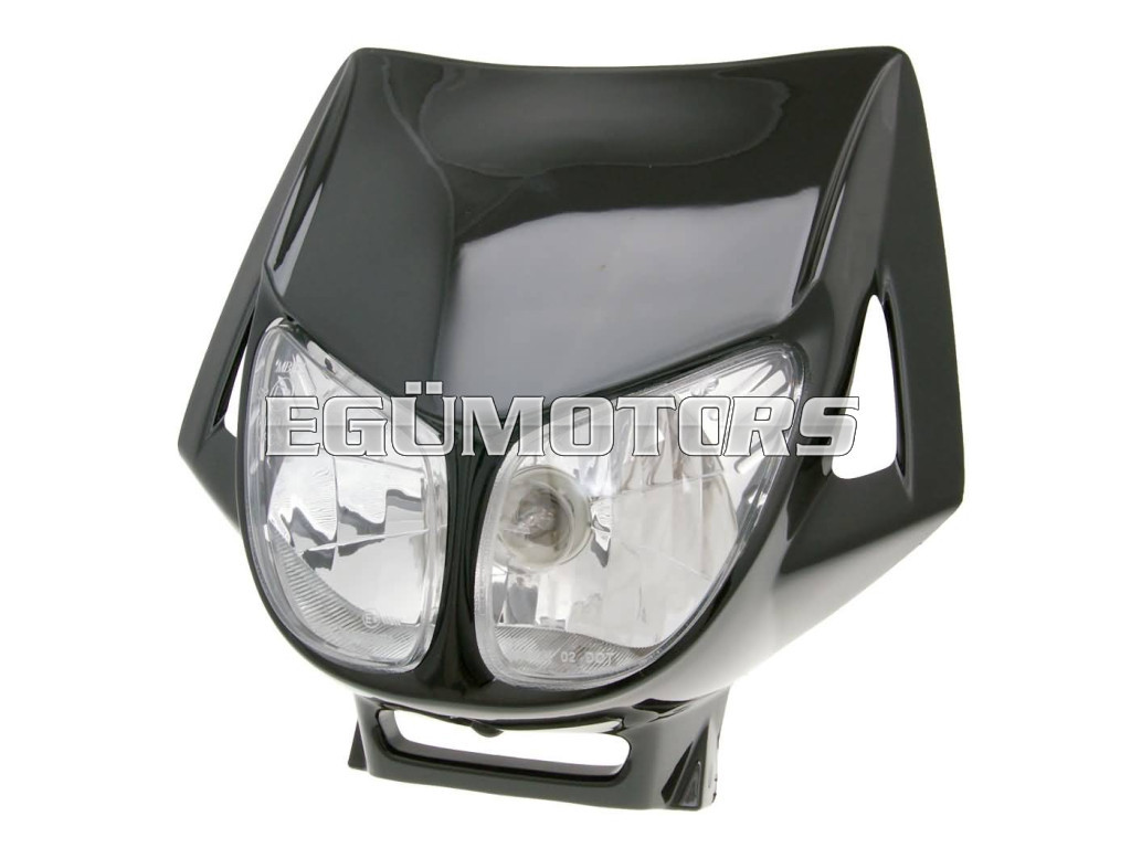 Fekete, dupla optikás fejidom Derbi Senda eredeti fényszóróihoz, E-jelzéssel.