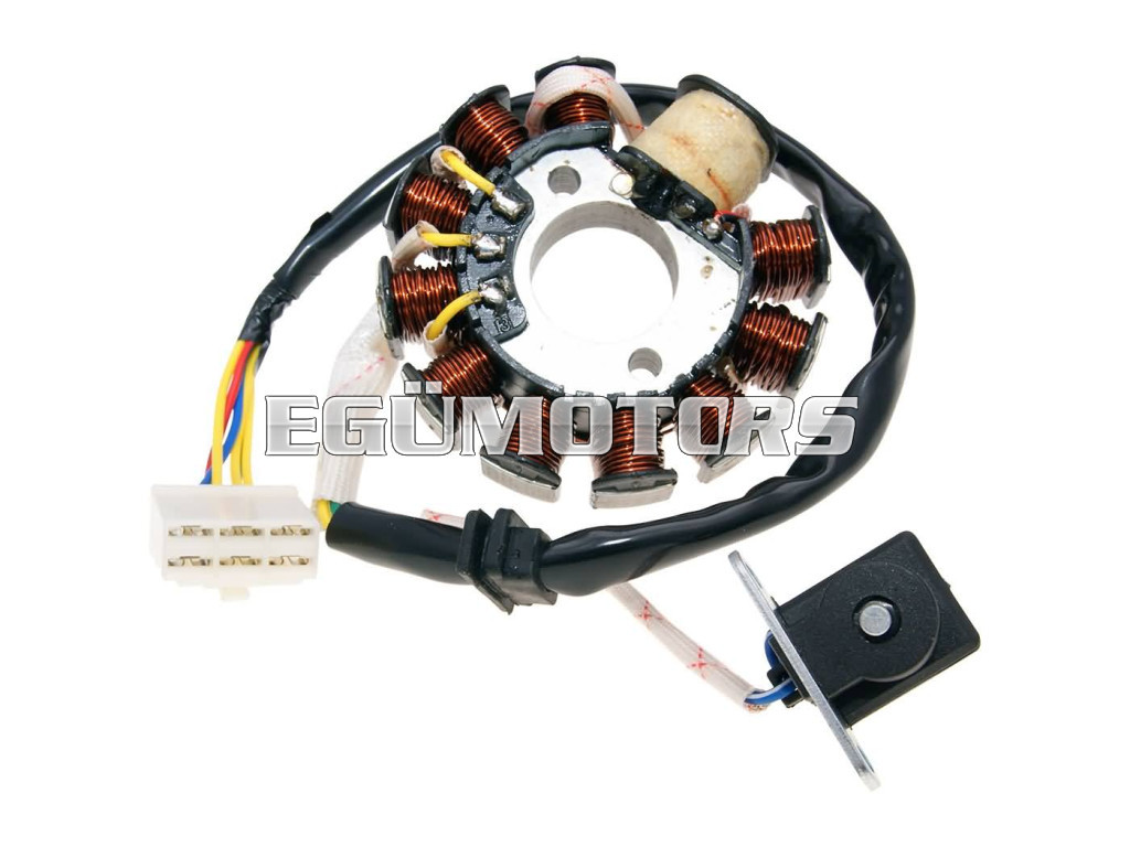 Ezekhez a motorokhoz többféle gyújtásalaplap létezik, azonban viszonylag könnyen azonosíthatók. A stator lehet 6, 8 vagy 11 tekercses, ezért kérjük, ellenőrizze, hogy Önnek melyik van. Ennél a 11 tekercses típusnál a csatlakozó kábel dugója 6 tűs.