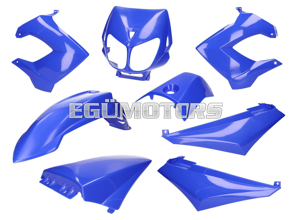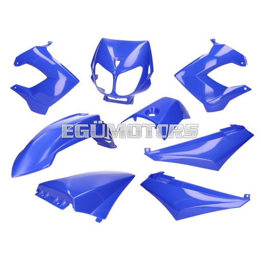 Kék, 8 darabos burkolatkészlet, amely kompatibilis Derbi Senda Supermoto és Enduro valamint DRD X-Treme váltós motorokkal.