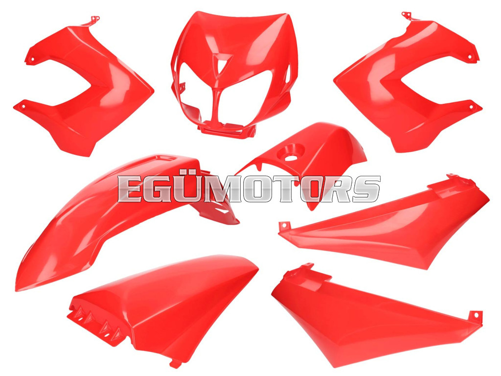 Piros, 8 darabos burkolatkészlet, amely kompatibilis Derbi Senda Supermoto és Enduro valamint DRD X-Treme váltós motorokkal.