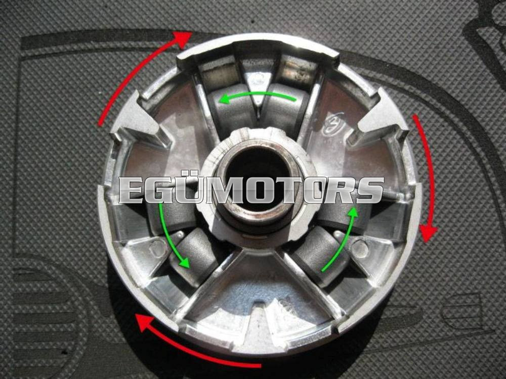 FIGYELEM! Forgásirányos görgő, beépítését körültekintően kell végezni, ellenkező esetben mind a görgő, mind a varió károsodhat, elkophat! A variátordobba úgy kell a görgőket behelyezni, hogy a görgők fedett oldalai az óramutató járásával ellentétes irányba néznek.