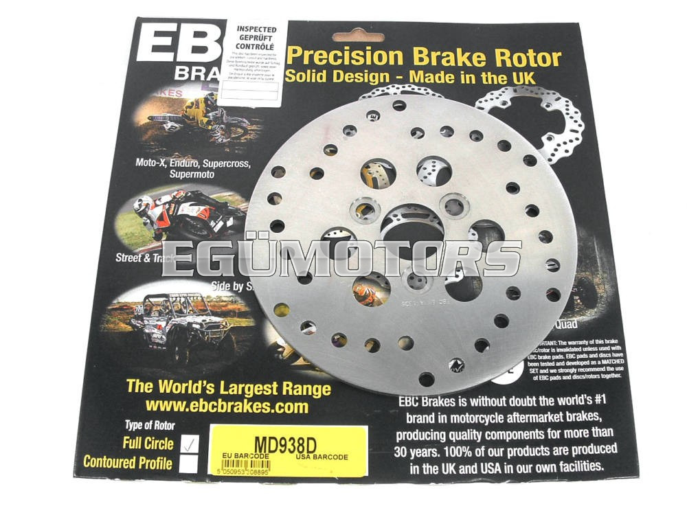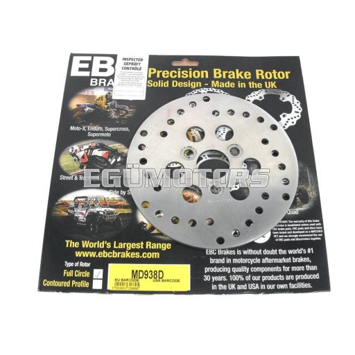 EBC gyártmányú, 180mm átmérőjű, merev kiképzésű első féktárcsa. Németországban készült, hőkezelt és edzett rozsdamentes acélból. Horizontális köszörüléssel készítik, minden EU minőségi és biztonsági szabványnak megfelel.