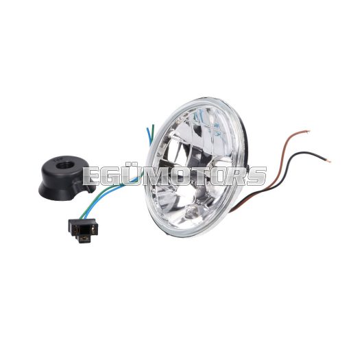 Kerek 140mm átmérőjű fényszóró átlátszó üveggel 12V H4 vagy HS1 halogén izzóhoz.