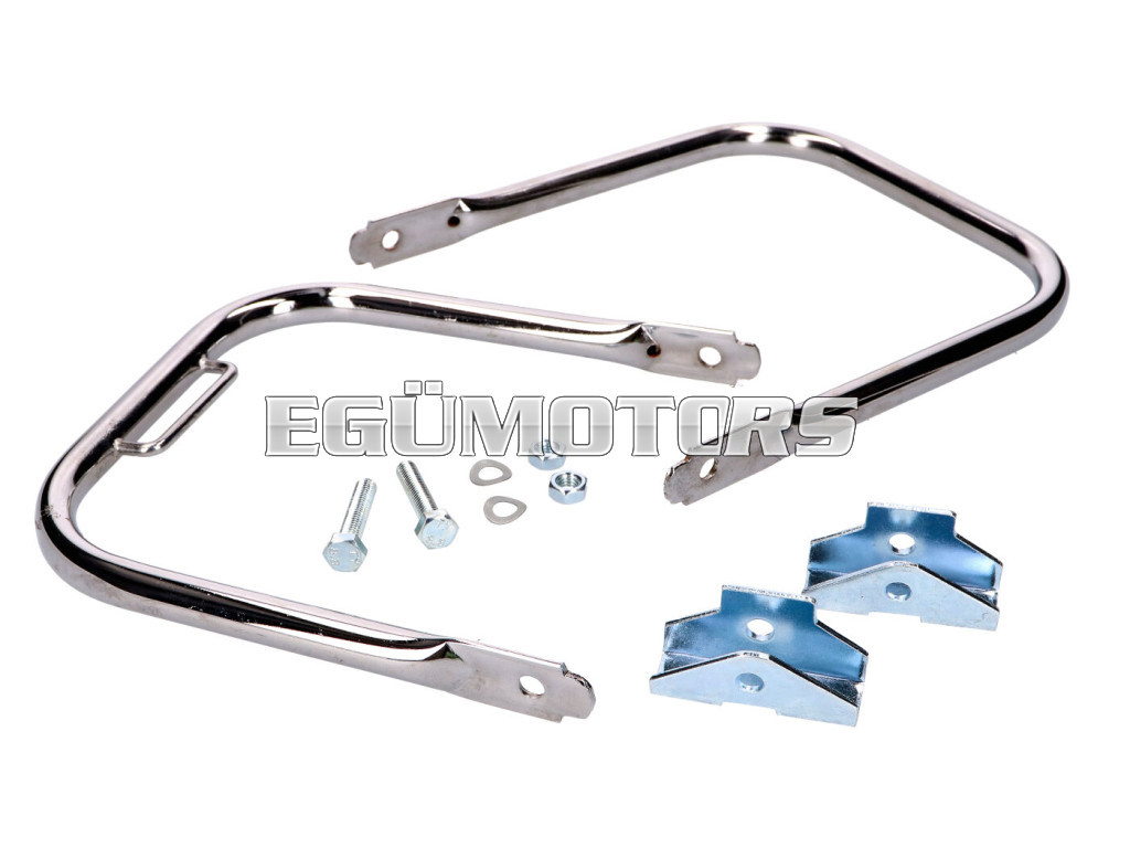 Hátsó csomagtartó készlet, krómozott, rövid típusú támasztó-/fogantyúval, szerelési anyaggal együtt, alkalmas Simson S50, S51, S70 modellekhez.