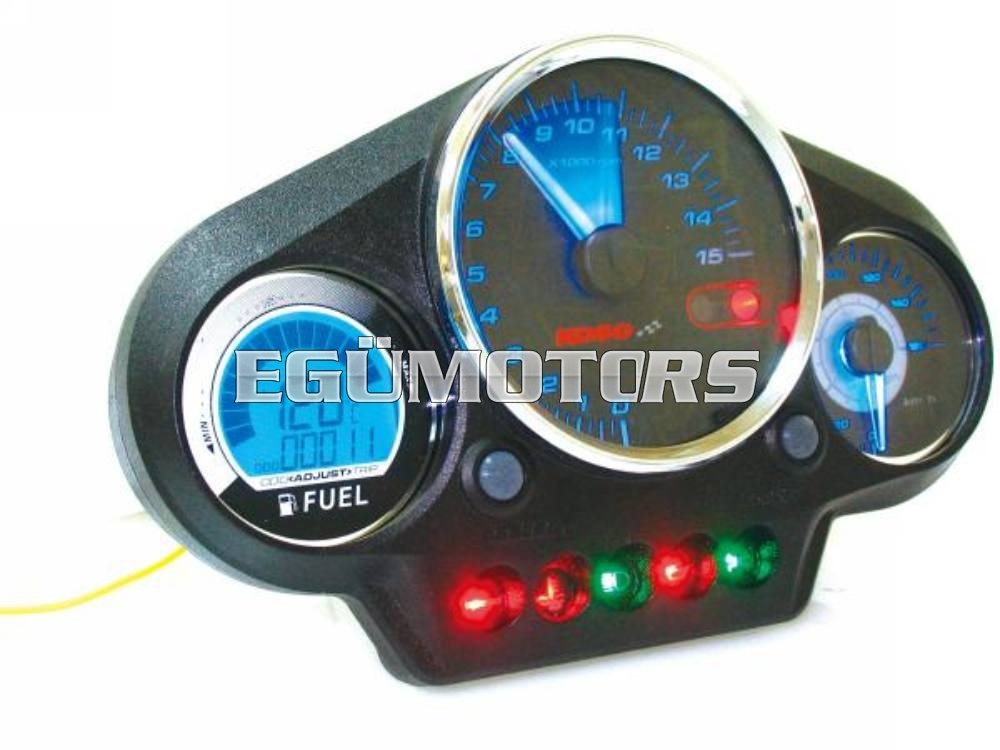 Grand Prix stílusú műszerfal, kék háttér világítással. A kilométeróra 160 km/h-ig skálázva, a fordulatszám fordulatszám mérő 15.000-ig mér.