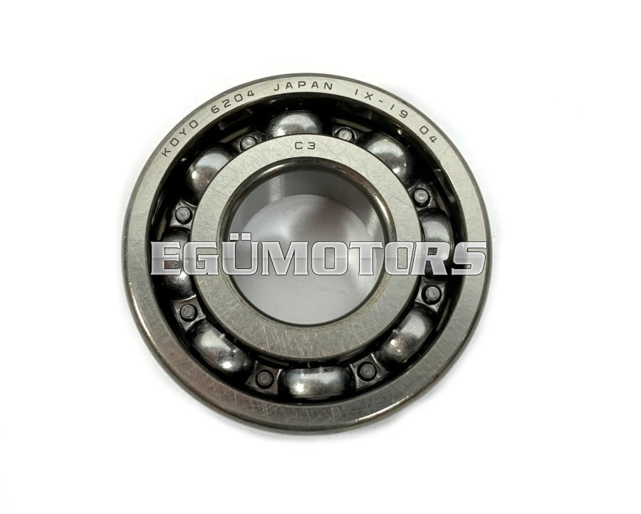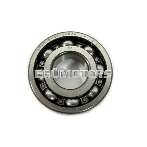 Egysoros, mélyhornyú Koyo golyóscsapágy speciális illesztési hézaggal (C3) a robogók főtengelyéhez, fémkosaras kivitel.