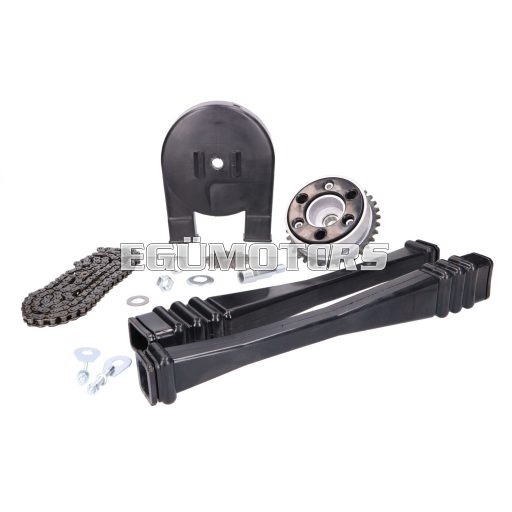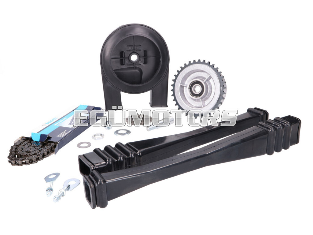 Teljes lánchajtás készlet lánckerekekkel, hajtólánccal és burkolattal, kiegészítő tartozékokkal.