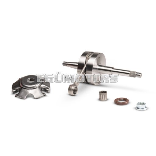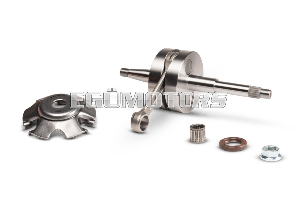 The Malossi crankshaft for the 100 cc cylinder is primarily composed of two half-shafts forged from special steel, machined on high-precision CNC tools, and then subjected to a thermochemical treatment involving carburizing, hardening, and cryogenic cooling in nitrogen. This process gives the halfshafts exceptional hardness and strength, essential for supporting the high power output generated by the 100 cc cylinder.