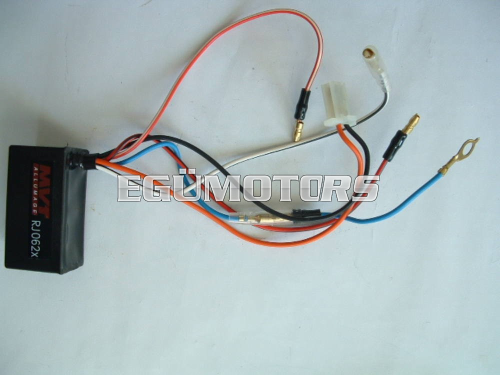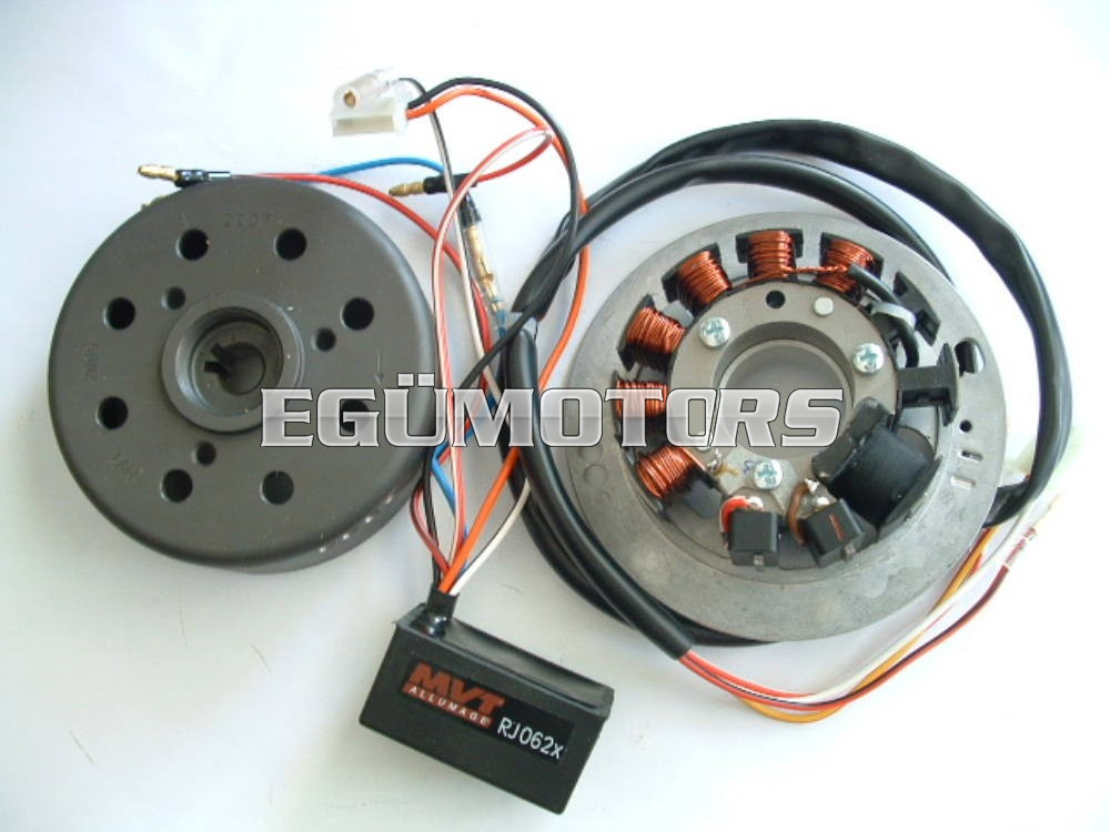Analóg CDI-t használ, más gyújtásokkal szemben nagyon előnyös tulajdonsága hogy változtatja az előgyújtás értékét. Körülbelül 10.000 rpm felett 15°-ot visszavesz, így akár növelt alapelőgyújtás mellett sem ég át a dugattyú! Az alapelőgyújtás értékét a forgatható alaplappal tudjuk beállítani, ennek kb. 27~30 foknak kell lennie. Az Analóg CDI egy a motorra hangolt gyújtásgörbével rendelkezik, ezt a CDI-t később egyszerűen egy MVT Digimax CDI-re cserélhetjük ami az analóg rendszert digitálisra cseréli. Ezzel a váltással akár 18 gyújtásgörbe áll majd rendelkezésre, ami egy kapcsoló átkapcsolásával választható.