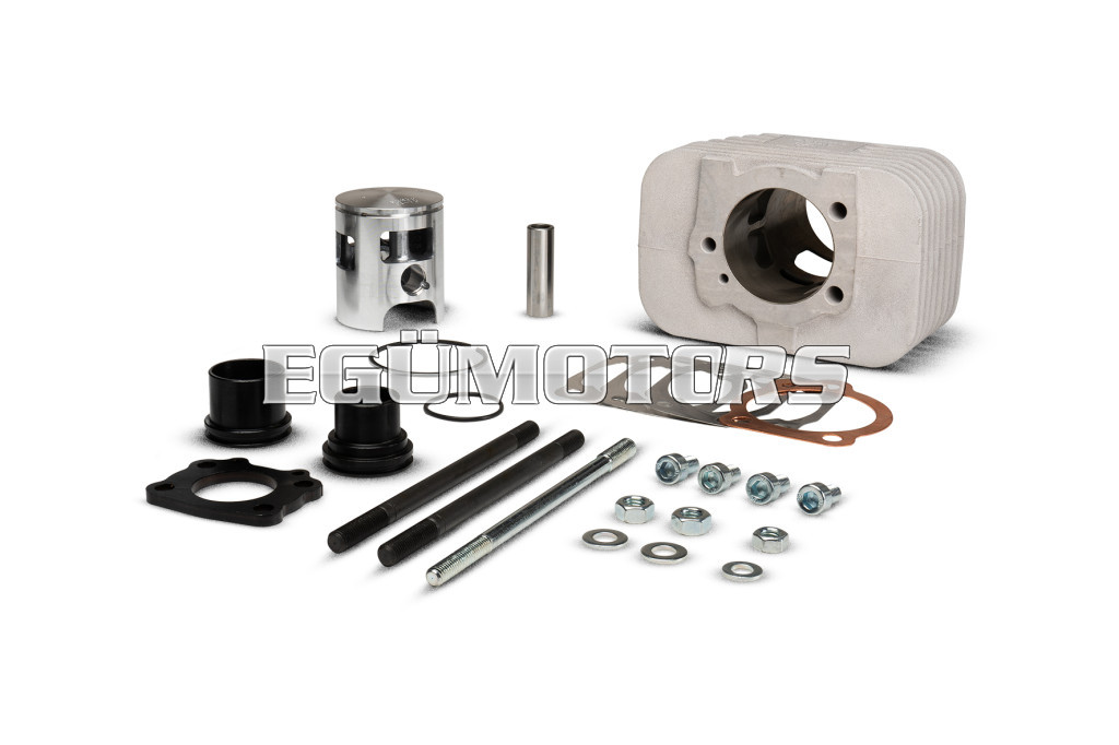 Made of the same high-strength aluminium alloy as our racing cylinders and nickel-chrome coating. The central core profile has been revamped around the ports to increase the heat exchange surface and improve the air cooling flow, allowing the fresh air to enter the combustion chamber at optimal temperature and pressure conditions, thus improving the volumetric efficiency of the engine. There is a support surface in the front part of the cylinder that has been machined and finished with high-precision tools, with four threaded holes required to connect it to the pipe assembly.