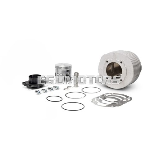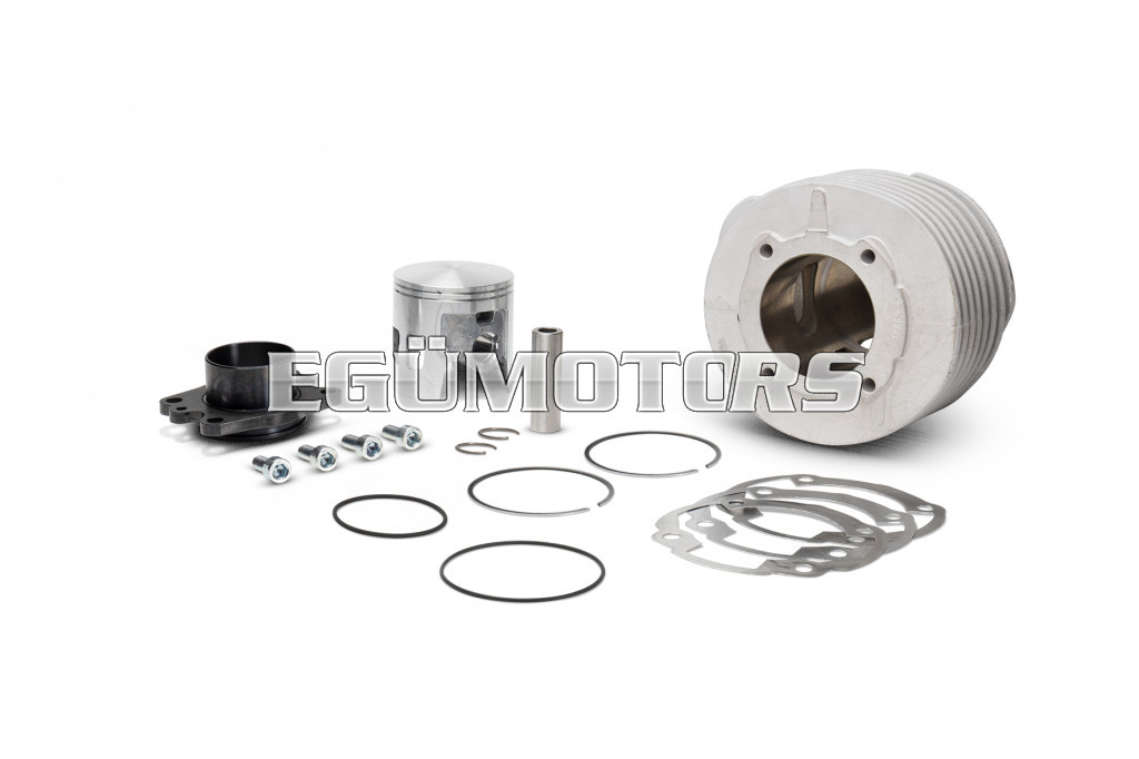 Built from scratch, in high-strength aluminium alloy and cylinder sleeve with nickel-chromium coating. Consisting of an even thickness central core around the cylinder sleeve and the ports, a constant heat exchange is ensured, therefore, a controlled intake temperature of the gases in the chamber and an optimal heat exchange at the exhaust. It has aerodynamically profiled cooling fins around the core, designed to be penetrated with the best possible efficiency by the cooling air. The major innovation lies in the totally revamped and coated ports, introducing the latest CVF, upgraded thanks to experience gained from competitions. There are now 7 ports, a distinctive trait of Malossi kits, thank to which you can get the best fluid dynamic performance.