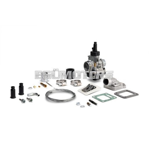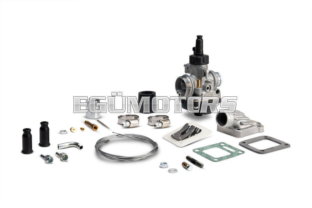 Carburettor with elastic connection (B) and adjusting screws on the right (D).