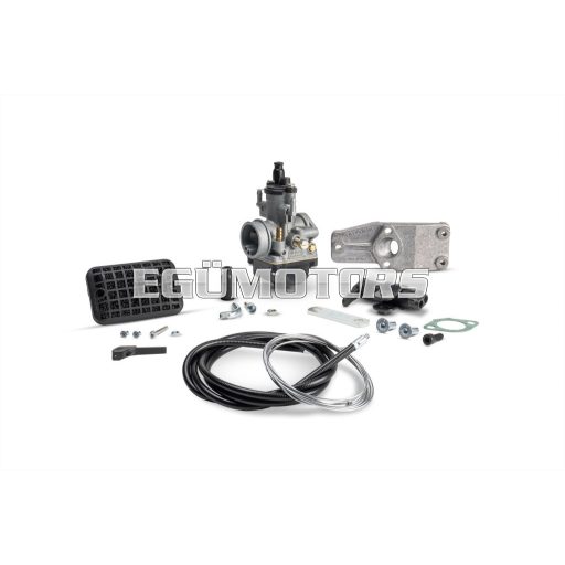 Carburettor with elastic connection (B) and adjusting screws on the right (D).