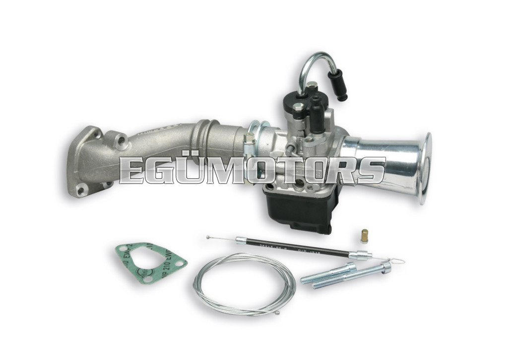 Carburettor with rigid connection (A) and adjusting screws on the right (D).
