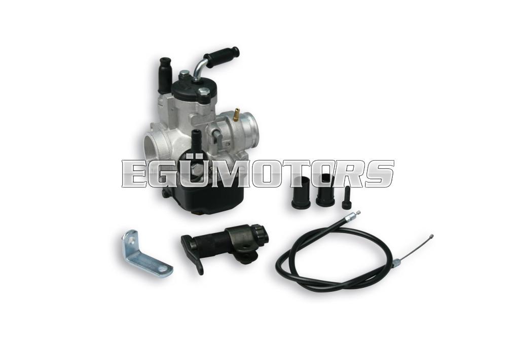 Carburettor with elastic connection (B) and adjusting screws on the right (D).