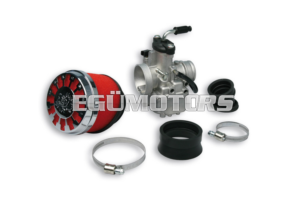 The greatest innovation of these new Malossi carburettor kits is the modular intake manifold. It allows to rotate the manifold into the flange according to the specific requirements of ones own vehicle, in order to identify which is the best angle for fitting the carburettor.