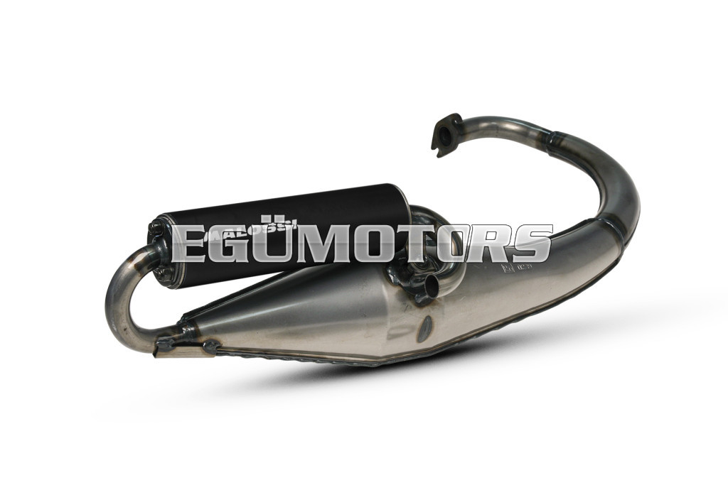 EXHAUST in special sheet steel (1.5 mm thickness) manufactured through the press working process. The exhaust features silencing baffles, aluminum alloy mounting brackets with vibration isolators. Clear-coat finish.