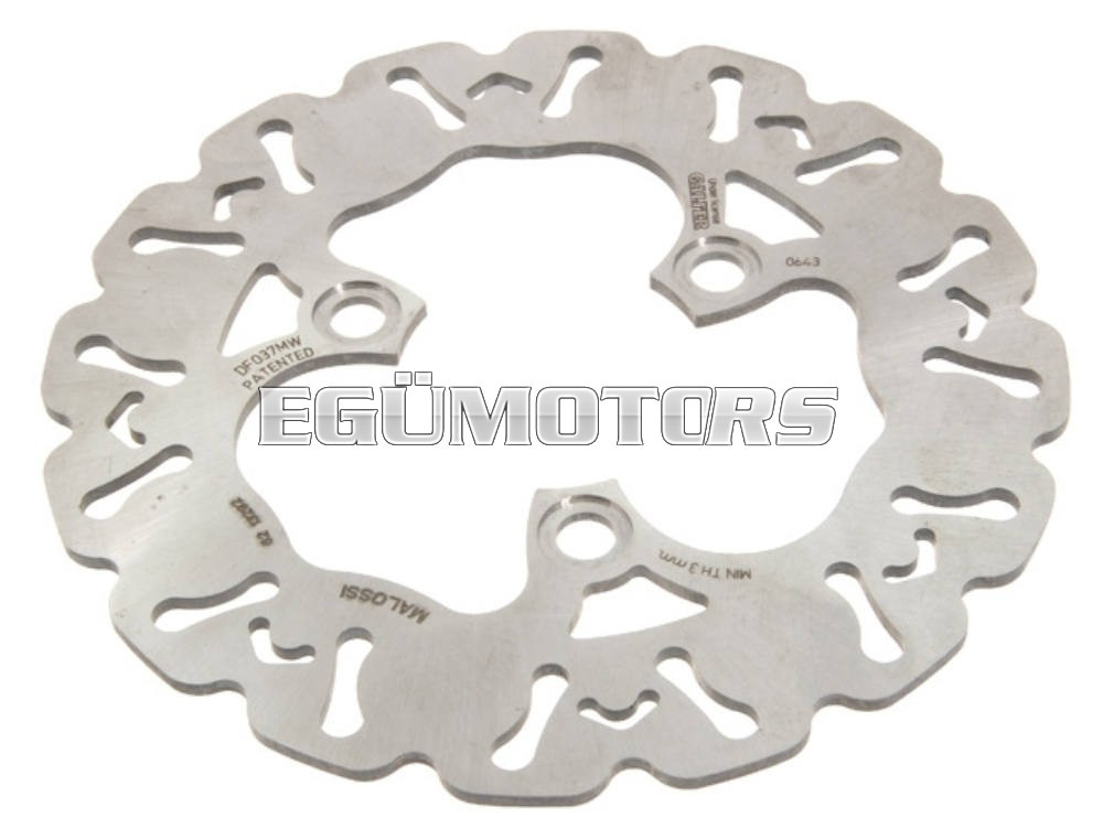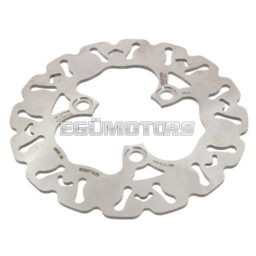 A Malossi új féktárcsája Yamaha Aerox és MBK Nitro típusokhoz. (D32) A gyárinál tartósabb anyagból készült, és kialakítása révén is sokkal jobban elvezeti a hőt egy ilyen „hullámos" féktárcsa.