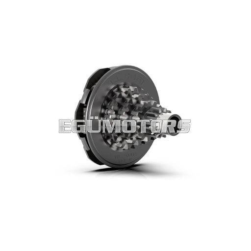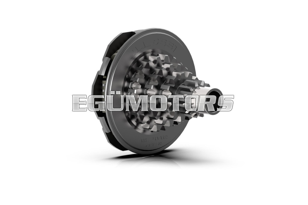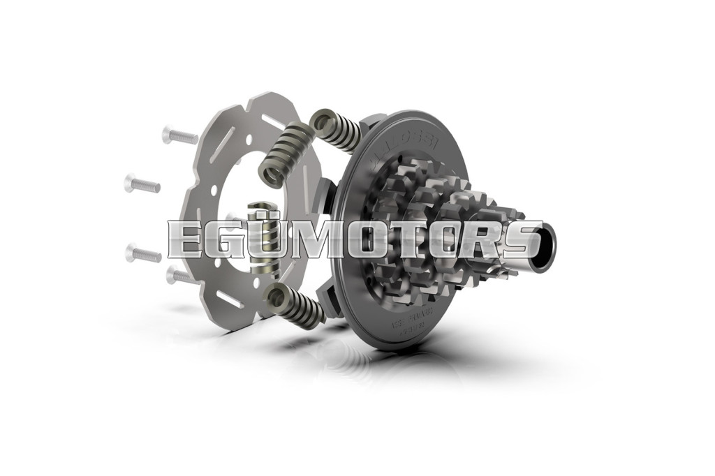Totally developed on a Malossi design, completely redesigned compared to the original. The sprockets have been moved towards the direction of the axis of rotation so as to allow a consistent spring support thickness. The newly designed springs are contained by a flange screwed to the axle.