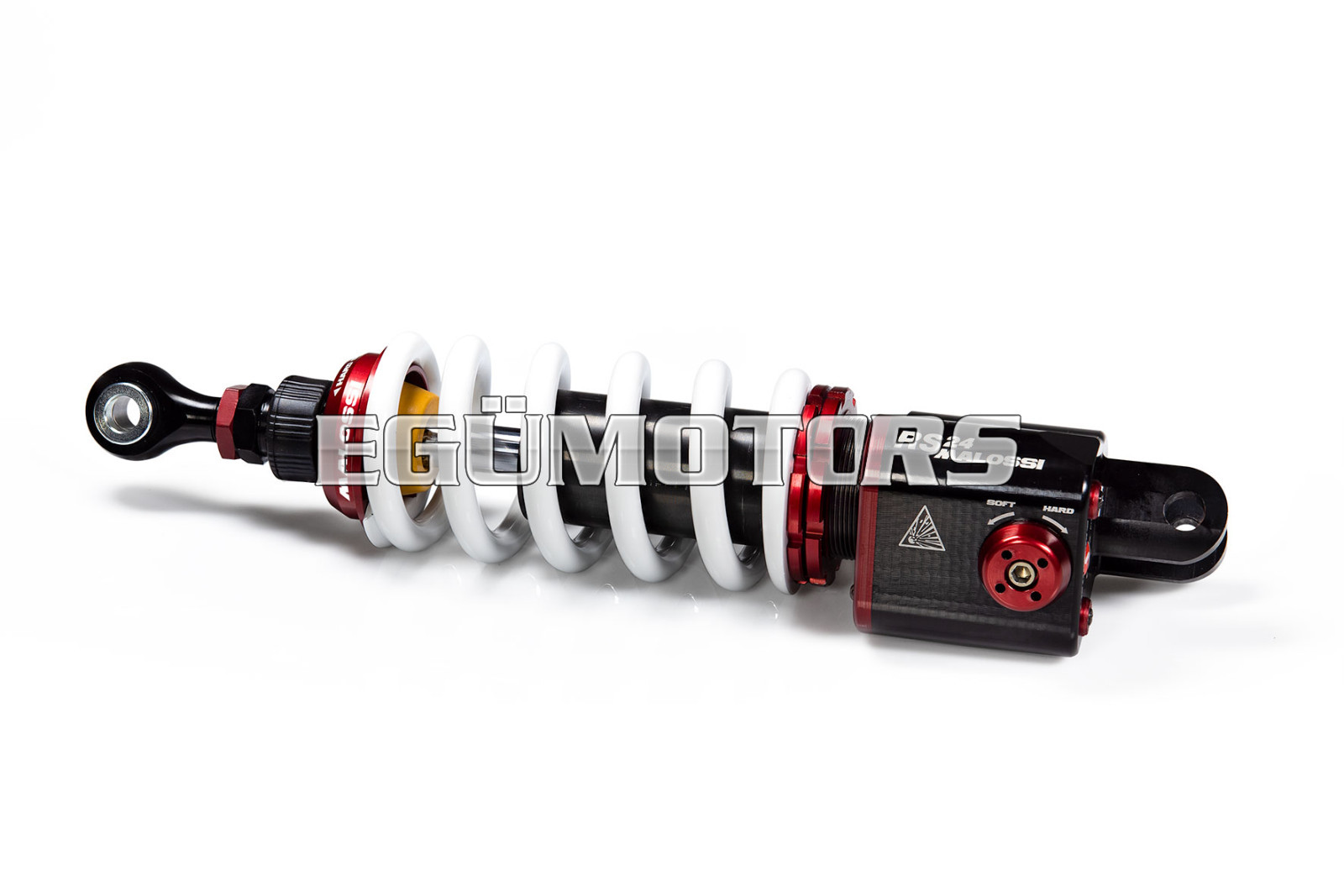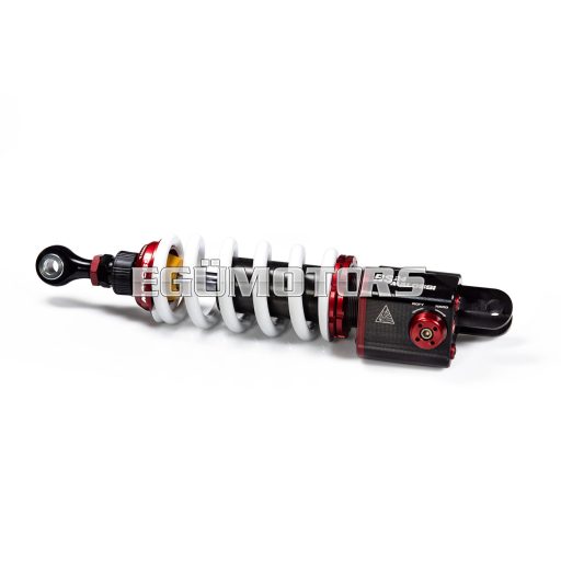 The RS24/10-R rear shock absorber for maxi scooters consists of a single body crossed by a newly-designed hydraulic circuit that allows all adjustments to be integrated while maintaining the same dimensions as the original shock absorber, without reducing the overall dimensioning of the hydraulic brake.