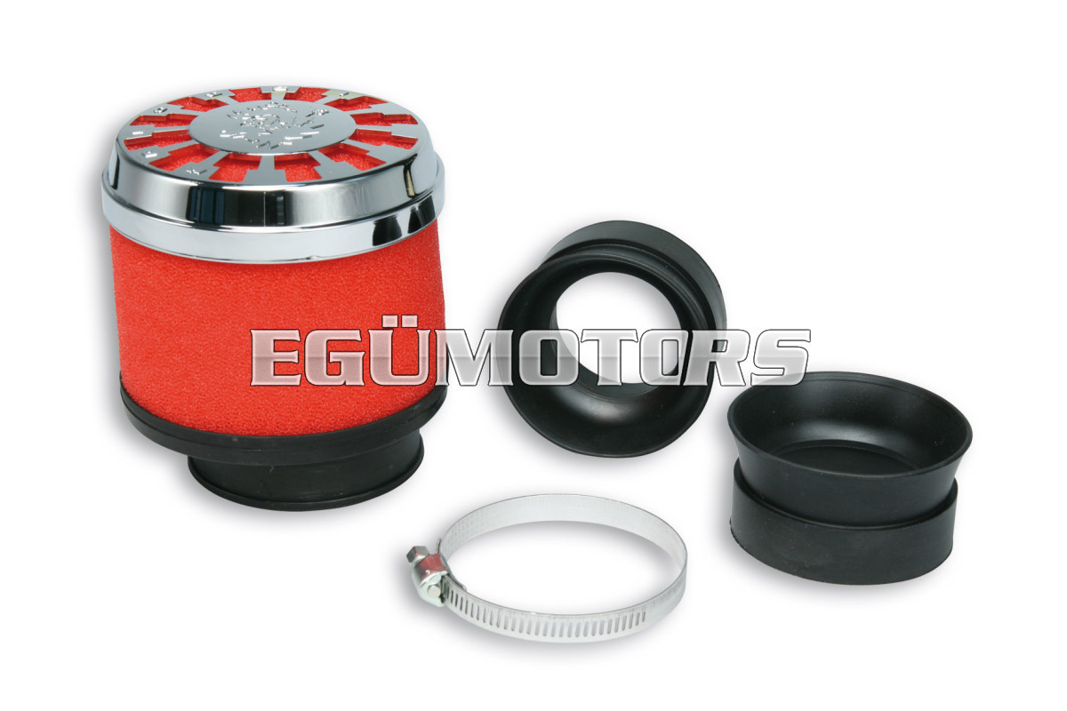 Air filter E13 with filtering component made of expanded self coming out polyurethane,suitable for Dellorto, Mikuni and Khein carburettors and for other applications.