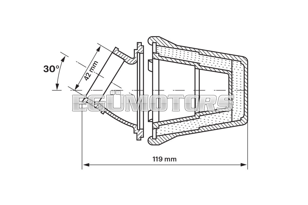 A csonkon kb. 30 fokos szögben áll a szűrő, csatlakozási mérete: 42 mm, teljes hossza 119 mm