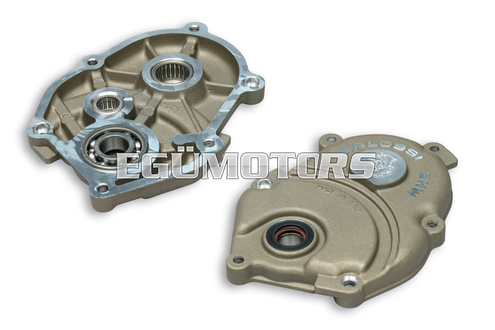Malossi, after revisiting the gear box assembly, has reduced friction drastically by replacing the original cover with the gravity cast cover, assembled with special bearings.
