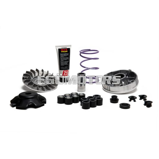To satisfy the innumerable adjustings required by racing scooters, depending on the track type and on the tuning of the engines, the Multivar MHR is supplied with 2 sets of 6 rollers and a counter-spring in pre-hardened silicon-chrome steel alloy with counter clockwise winding (racing). In addition, other springs of the same class with different loads are available as options.