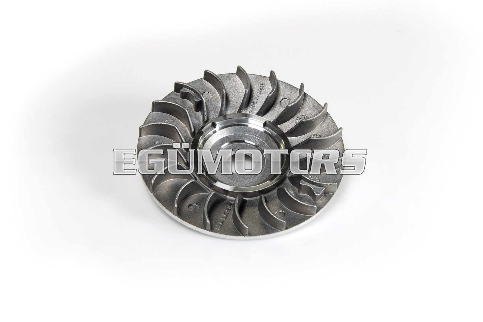 It’s a fixed half-pulley with a diamond finish of the belt-side pulley surface and a redesigned working angle to further increase the gearing range. This component completes the Multivar and renders it unparalleled. Specially designed for the line of variable-speed drives for scooters, it further improves the performance of the drive belt. It is not just a simple accessory, but a very important part for guaranteeing the long life of all the transmission components. The temperatures produced inside the crankcases where variators work with V-belts are prohibitive at critical moments and certain parts, such as transmission belts and variator rollers, sometimes suffer irreparable damage. There are cases in which the rollers could even reach the melting point. Apart from its other advantages, Ventilvar has a greater cooling capacity than the original half-pulley; that’s a result that makes it indispensable for safe and sporty driving.