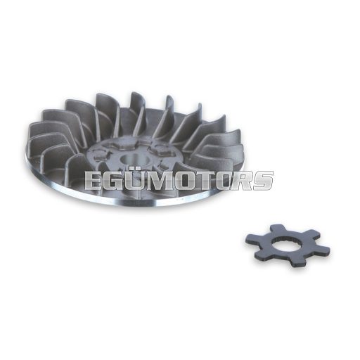 It’s a fixed half-pulley with a diamond finish of the belt-side pulley surface and a redesigned working angle to further increase the gearing range. This component completes the Multivar and renders it unparalleled. Specially designed for the line of variable-speed drives for scooters, it further improves the performance of the drive belt. It is not just a simple accessory, but a very important part for guaranteeing the long life of all the transmission components. The temperatures produced inside the crankcases where variators work with V-belts are prohibitive at critical moments and certain parts, such as transmission belts and variator rollers, sometimes suffer irreparable damage. There are cases in which the rollers could even reach the melting point. Apart from its other advantages, Ventilvar has a greater cooling capacity than the original half-pulley; that’s a result that makes it indispensable for safe and sporty driving.