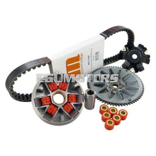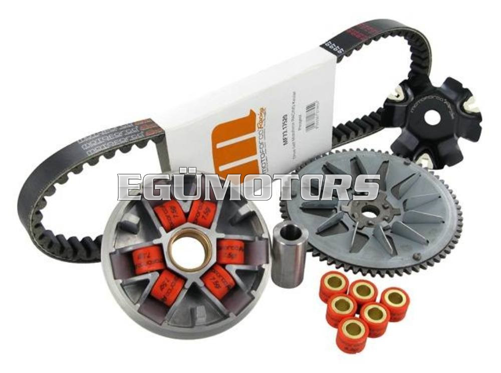 A szett tartalmazza az új verziós Motoforce Racing variátort, két garnitúra görgőt a tökéletes beállításhoz (16x13: 7.5g és 8.5g), variátor külső tárcsát, varió hűtő ventilátort, berúgó racsni ellenkereket és egy jó minőségű Motoforce Racing kevláros ékszíjat.