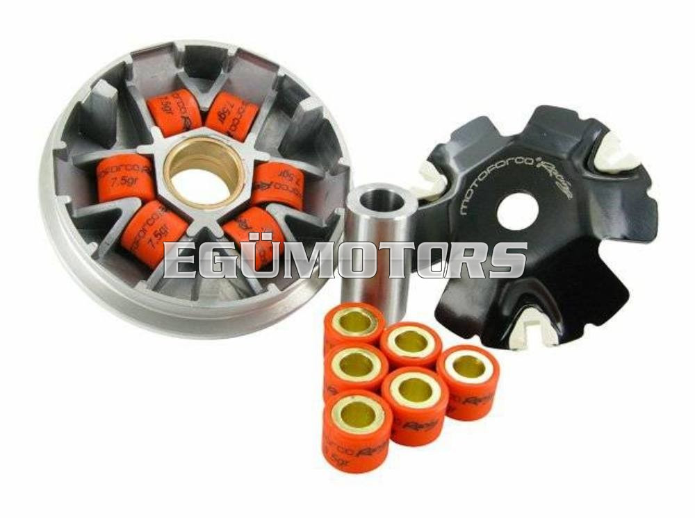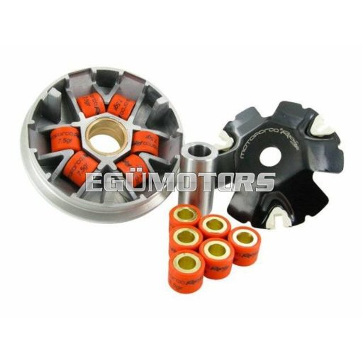 Motoforce Racing komplett variátor. Maximálisan egyezik a gyári variátorral, beépítése nem változtatja meg a robogó teljesítményét. A variátor tartalmaz két szett görgőt is.