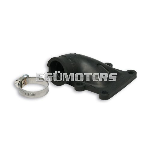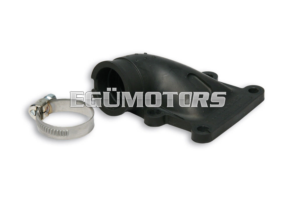 Malossi rubber manifolds feature a composite structure. Their construction begins with an aluminium insert that is encased in a special plastic material that is impervious to oils and fuels, guaranteeing increased rigidity at the point of attachment to the casing and greater flexibility of the manifold body.