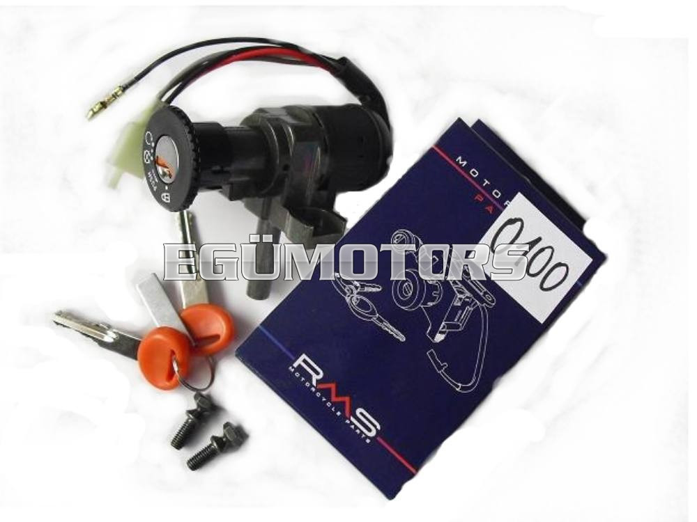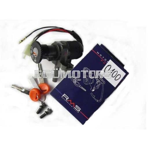 RMS Olasz gyártmányú Malaguti F12 50/100ccm gyújtáskapcsoló, 2db kulccsal. A tönkrement, szétesett zárszerkezet lecserélésére alkalmas.