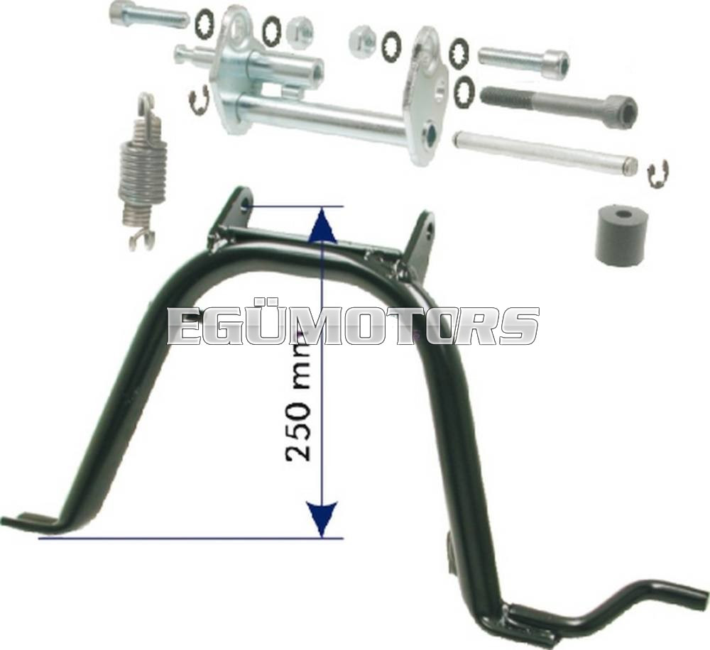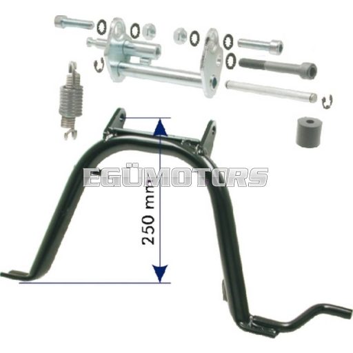 RMS javító konzolos középállvány, fekete fényezéssel és a felszereléshez szükséges összes tartozékkal. Ha az eredeti sztender rögzítő csap furata sérült a blokk alján (ki van törve), akkor kell ezt a terméket választani. Először a konzolokat kell a blokk aljára rögzíteni és utána egy könnyű mozdulattal illeszthető a sztender.