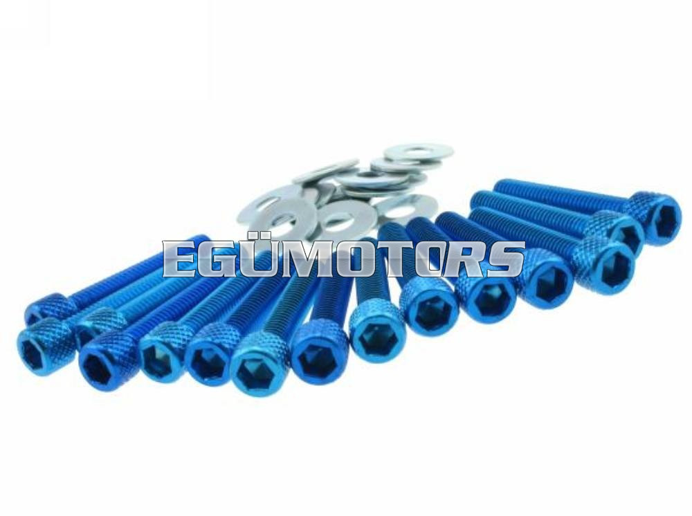 Kék dekni csavarszett, Minarelli motoros robogók variátor fedeléhez. A csavarok anodizált alumíniumból készültek,