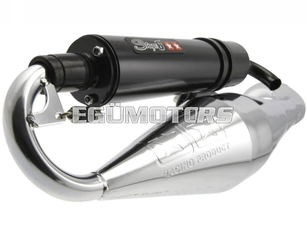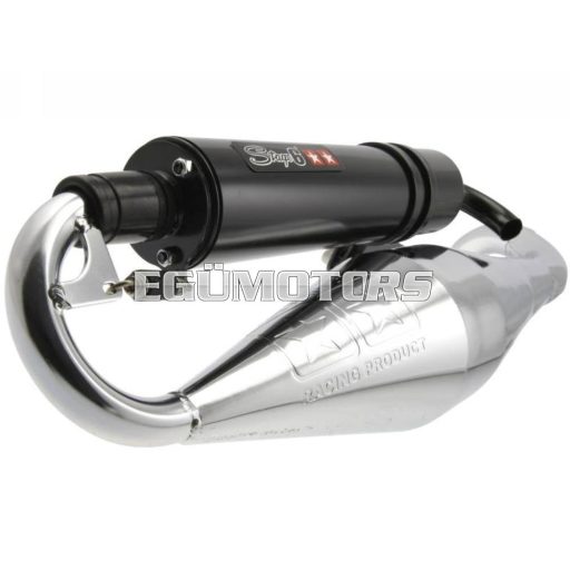 Egy nagyon erős és nyomatékos Mid-Race kipufogó, élesebb sport hengerekhez! A rezonátor test alapja a Stage6 Pro, azonban a könyökrésznél kicsit módosították, hogy az alsó és középső fordulattartományban még jobb teljesítmény legyen elérhető. Igényes kidolgozásra vall az is, hogy a hangtompító dob is rugóval van rögzítve.