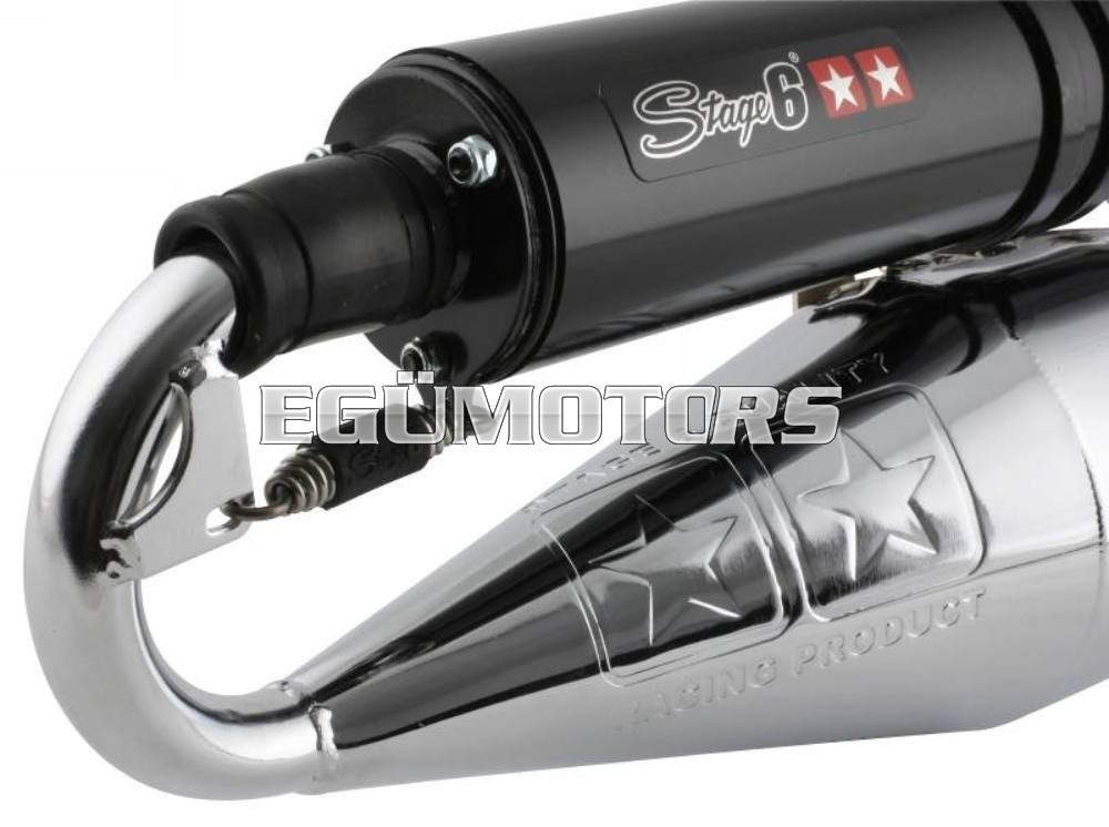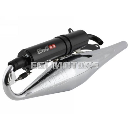 Egy nagyon erős és nyomatékos Mid-Race kipufogó, élesebb sport hengerekhez! A rezonátor test alapja a Stage6 Pro, azonban a könyökrésznél kicsit módosították, hogy az alsó és középső fordulattartományban még jobb teljesítmény legyen elérhető. Igényes kidolgozásra vall az is, hogy a hangtompító dob is rugóval van rögzítve.
