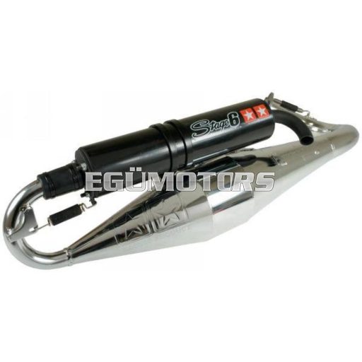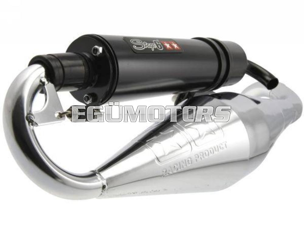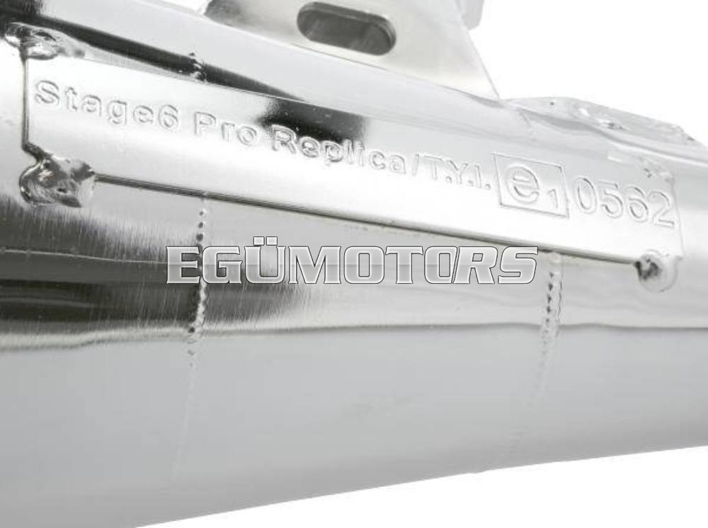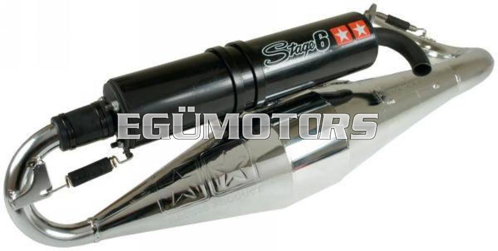 Egy igazán szép kidolgozású és jó teljesítményű sportkipufogó a Stage6-tól. A krómozott test jól ellenáll az időjárás viszontagságainak, ráadásul még mutatós is.