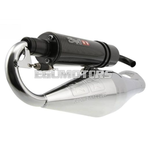 Egy igazán szép kidolgozású és jó teljesítményű sportkipufogó a Stage6-tól. A krómozott test jól ellenáll az időjárás viszontagságainak, ráadásul még mutatós is.