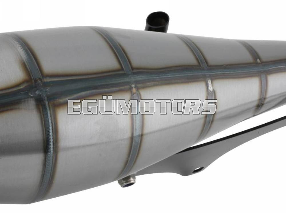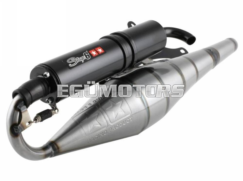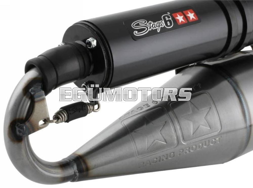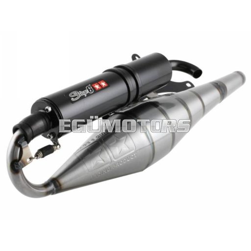 Egy nagyon erős és nyomatékos Mid-Race kipufogó, élesebb sport hengerekhez! A rezonátor test alapja a Stage6 Pro, azonban a könyökrésznél kicsit módosították, hogy az alsó és középső fordulattartományban még jobb teljesítmény legyen elérhető. Igényes kidolgozásra vall az is, hogy a hangtompító dob is rugóval van rögzítve.
