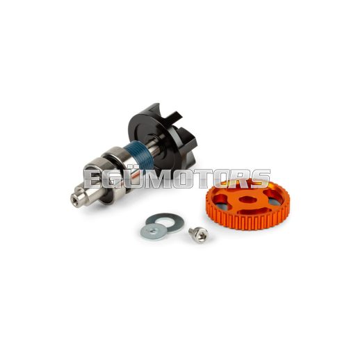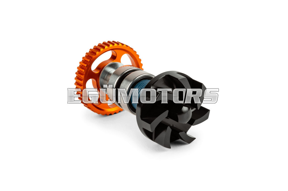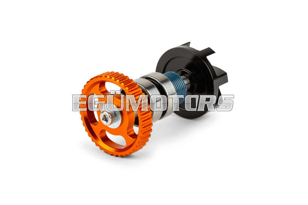 Az ultra-könnyű, CNC-vel mart könnyített alumínium meghajtókerék növeli a hajtási hatékonyságot, lényegesen kisebb a forgó tömeg. (az eredeti kerék 117 gr!). A narancssárgára eloxált kerék optikailag is mutatós, ha kivágott oldaldeknit használunk. Más rendszerektől eltérően itt a fogaskereket nem az olajpumpára, hanem egyenesen a vízpumpa tengelyére kell szerelni, ami -mégegyszer- kisebb tömeget eredményez és a vízpumpa szíj cseréjét is megkönnyíti.