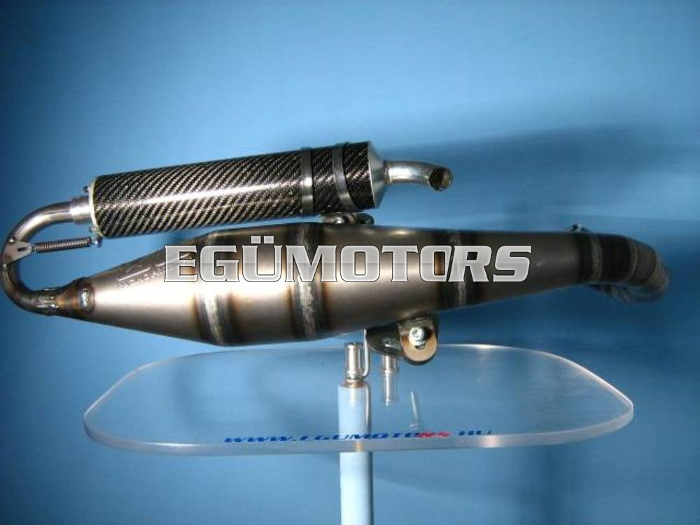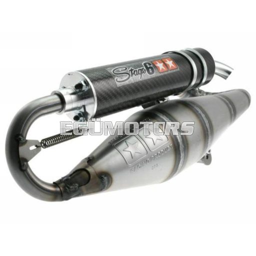 A végdob rugóval rögzíthető, mint a Yasuni versenycsöveinél. 70 ccm-es versenyhengerekhez. A Stage6 legújabb fejlesztése kb. 2 LE-vel erősebb mint a S6 PRO és 1500/min-el magasabb az elérhető fordulat. Az anyagának köszönhetően jellegzetes, szép hangú (hangos!) cső. Nagy teljesítmény, lakkozatlan kivitel, valódi, fekete karbon véggel.