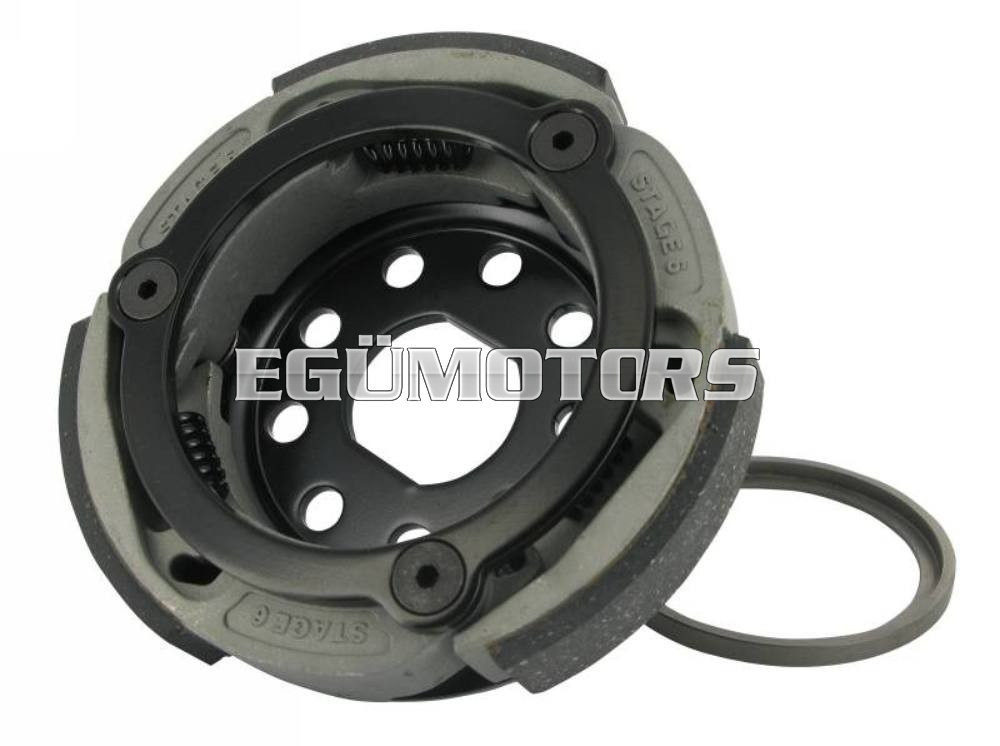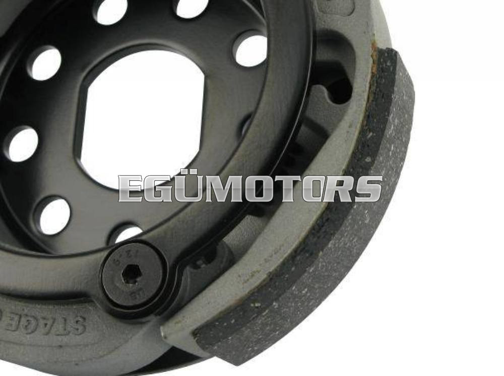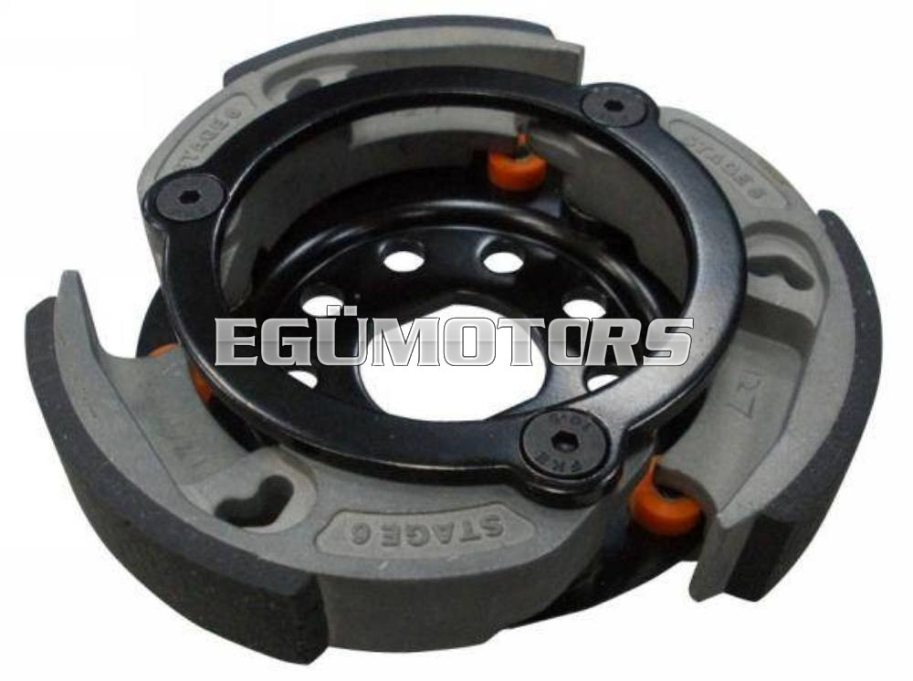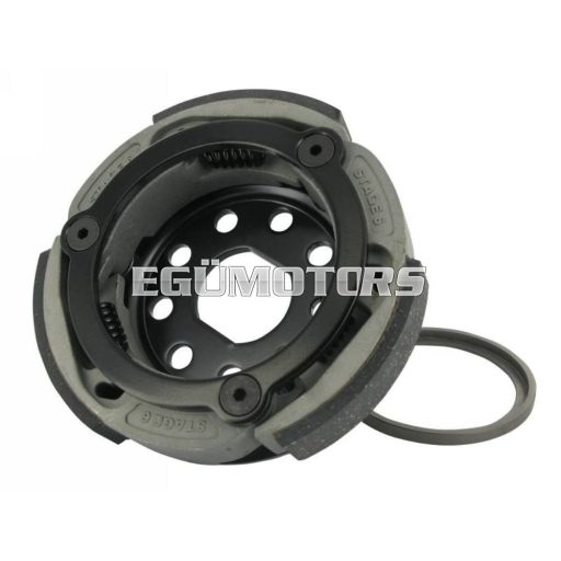 A kuplunggyűrű erősített, kovácsolt és csavarozott csapok hordják az erősített pofákat. Más kuplungokon csak szegecselt csapokat találni amik gyakran deformálódnak, elgörbülnek. A Stage6 Pro egy olcsó alkatrész, alternatíva az ismert sportkuplungok helyett. 30.5 mm hosszú kisrugók használhatóak hozzá.