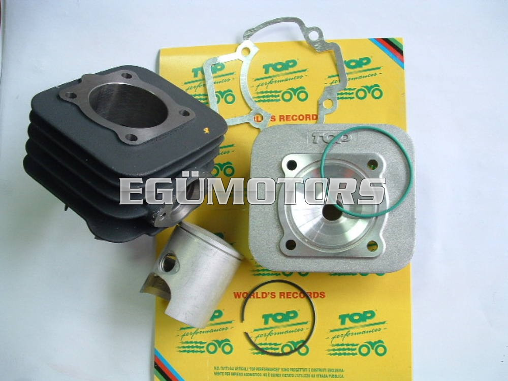 Top Racing öntöttvas (Minacrom) henger, 1 gyűrűs dugóval, léghűtéses Piaggio/Gilera robogókhoz. Extrém magas teljesítményt nyújtó hengerszett. Megfelelő kipufogó (Nardo) és karburátor, minimum 19-es használata elengedhetetlen.