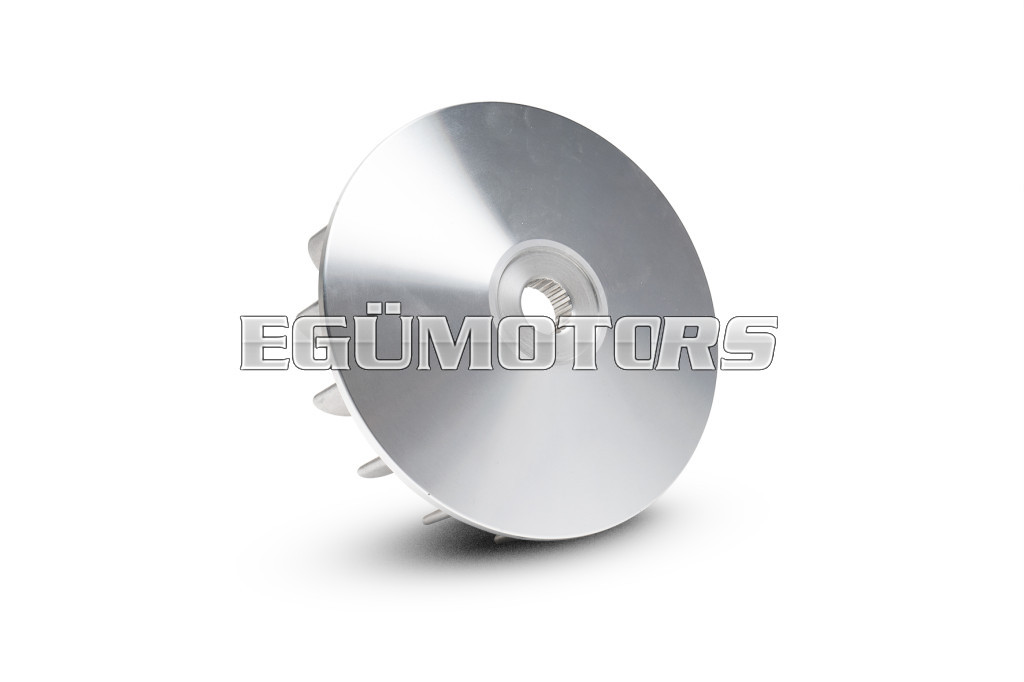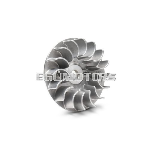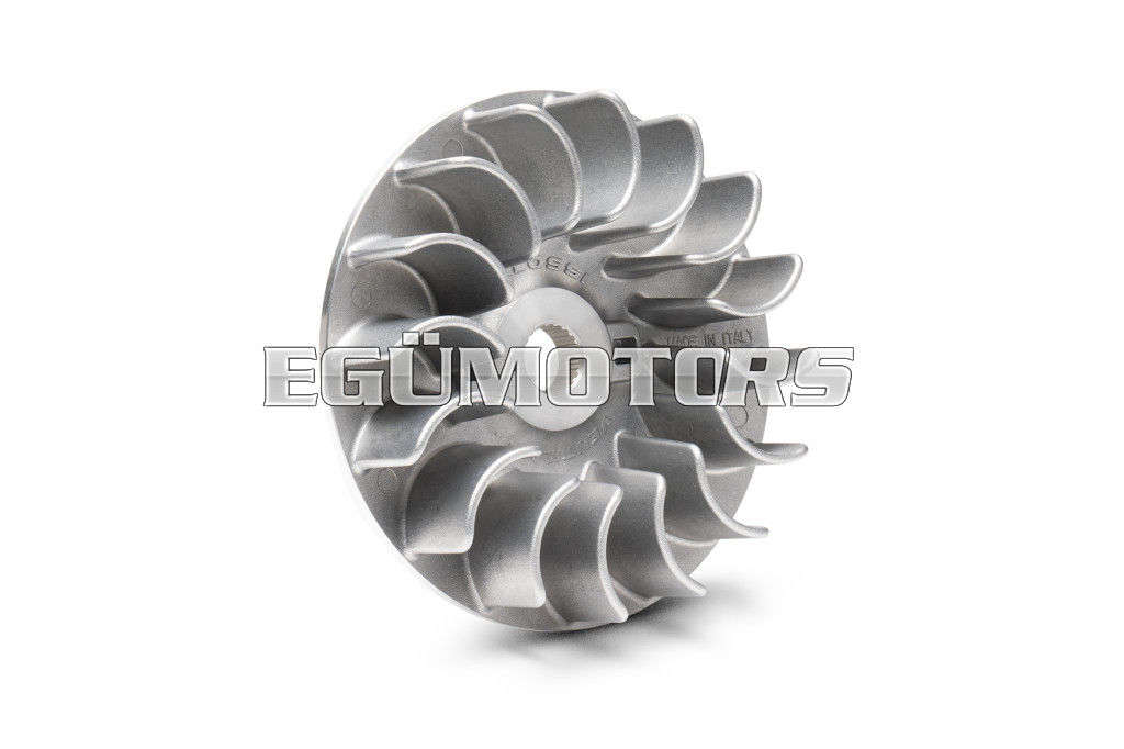 It’s a fixed half-pulley with a diamond finish of the belt-side pulley surface and a redesigned working angle to further increase the gearing range. This component completes the Multivar and renders it unparalleled. Specially designed for the line of variable-speed drives for scooters, it further improves the performance of the drive belt. It is not just a simple accessory, but a very important part for guaranteeing the long life of all the transmission components. The temperatures produced inside the crankcases where variators work with V-belts are prohibitive at critical moments and certain parts, such as transmission belts and variator rollers, sometimes suffer irreparable damage. There are cases in which the rollers could even reach the melting point. Apart from its other advantages, Ventilvar has a greater cooling capacity than the original half-pulley; that’s a result that makes it indispensable for safe and sporty driving.
