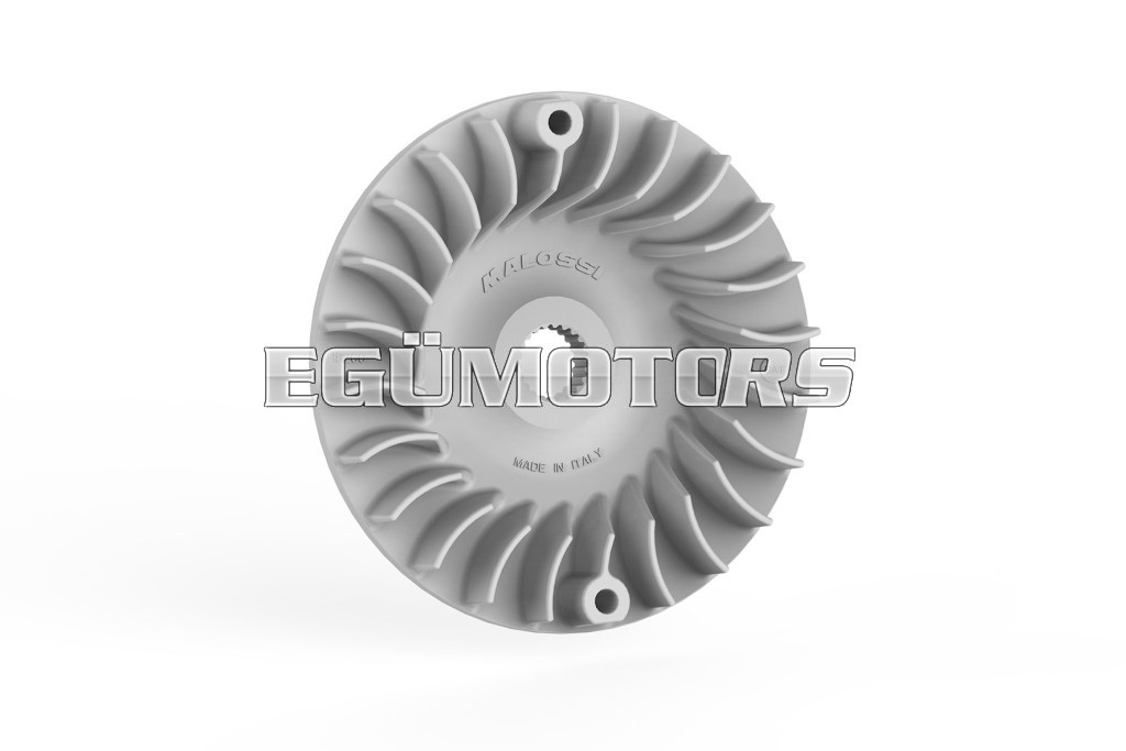 It’s a fixed half-pulley with a diamond finish of the belt-side pulley surface and a redesigned working angle to further increase the gearing range. This component completes the Multivar and renders it unparalleled. Specially designed for the line of variable-speed drives for scooters, it further improves the performance of the drive belt. It is not just a simple accessory, but a very important part for guaranteeing the long life of all the transmission components. The temperatures produced inside the crankcases where variators work with V-belts are prohibitive at critical moments and certain parts, such as transmission belts and variator rollers, sometimes suffer irreparable damage. There are cases in which the rollers could even reach the melting point. Apart from its other advantages, Ventilvar has a greater cooling capacity than the original half-pulley; that’s a result that makes it indispensable for safe and sporty driving.