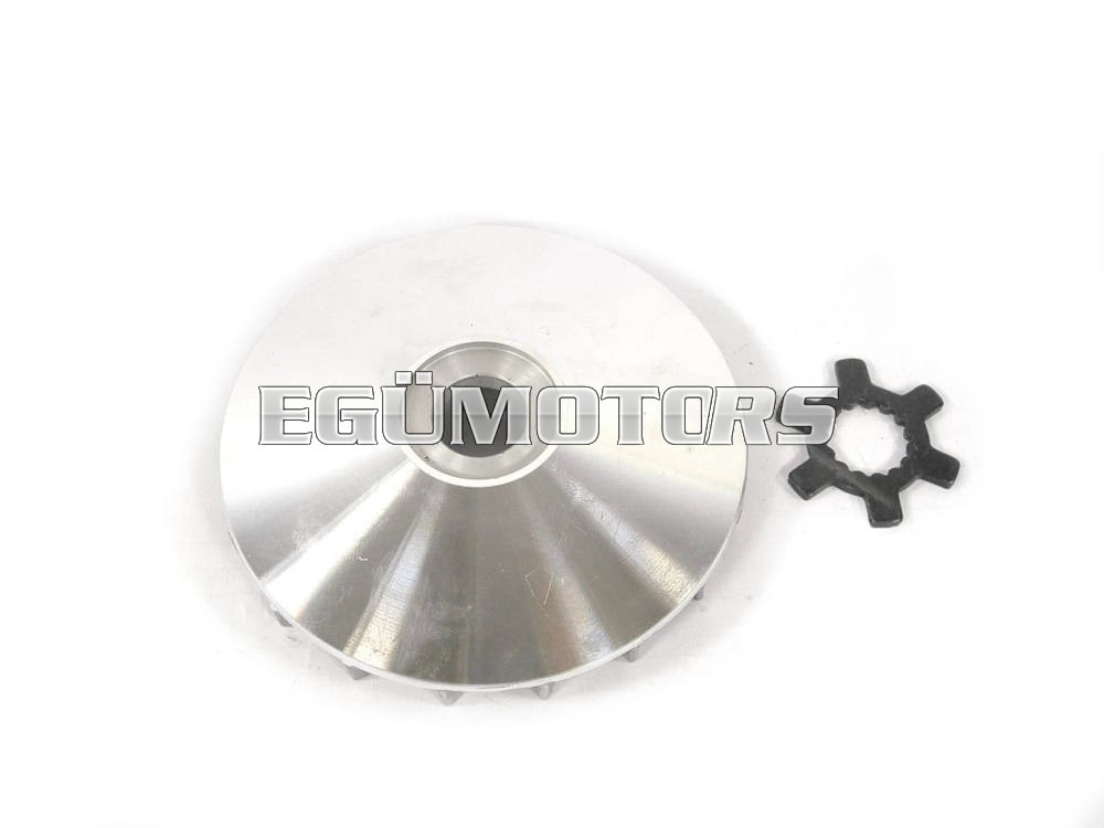 Gyári robogó variátor külső tárcsa (első szíjtárcsa) kétütemű 50-es robogókhoz. A sérült, megkopott, hullámos felületű külsőtárcsa lecserélésére alkalmas. Cseréje olcsó, amennyiben a mostani szíjtárcsánk kopott, nem érdemes gondolkodni a felújításon.