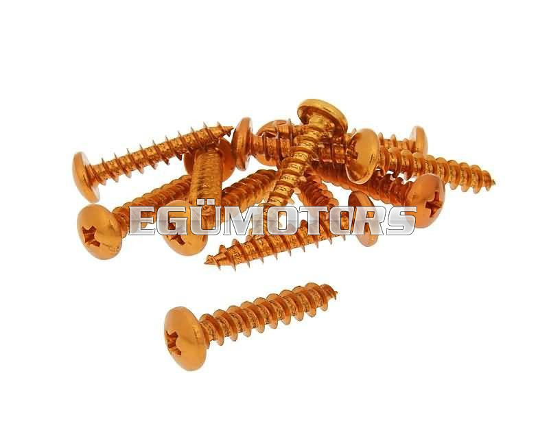 A csomag 12 darab narancssárga anodizált csavart tartalmaz, 30 mm hosszú, M6-os menettel.