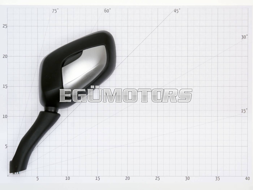 Csere jobb oldali tükör, az OEM specifikációnak megfelelően, E-tanúsítvánnyal a Sym Euro MX, Shark, VS 125 és 150 maxi robogókhoz.